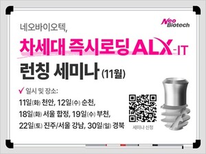 [덴탈뉴스=홍혜진 기자] ㈜네오바이오텍(대표 허영구, 이하 네오)이 11월 11일(화)부터 30일(일)까지 천안, 순천, 부천, 경남 진주, 경북 구미, 서울(합정), 서울(강남) 등 전국 7개 지역에서 차세대 즉시로딩 임플란트 ‘ALX-IT’ 세미나를 개최한다.네오의 ALX-IT는 차별화된 독창적인 바디 디자인과 탁월한 성능으로 시술 편의성을 높였으며, Narrow한 코어와 Deep thread & wide pitch를 통해 BIC(Bone to implant contact)를 극대화해 즉시로딩에 최적화된 차세대 임플란트다. 특히