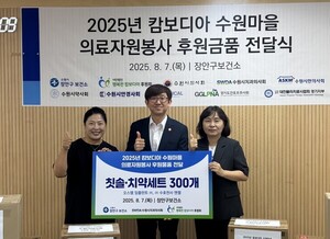 [덴탈뉴스=홍혜진 기자] 수원시치과의사회(회장 민봉기)는 지난 7일 장안구보건소에서 열린 ‘2025년 캄보디아 수원마을 의료자원봉사 후원금품 전달식’에 참여해 칫솔, 치약세트 300개를 전달했다.이날 행사에는 민봉기 회장, 김정원(장안구보건소) 소장을 비롯해 관내 보건의료단체 관계자들이 참석했다. 전달된 후원 물품은 ▲칫솔, 치약세트 300개(수원시치과의사회) ▲치약 500개(수원시의사회) ▲비누 1000개, 한방 파스 200봉, 한방의약품 1050포(수원시한의사회) ▲구충제 500정·소아용 비타민C 2000개(수원시약사회) ▲휠체