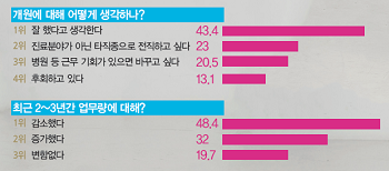 최근 2~3년간의 업무량에 대해서는 전체 응답자(48.45%)가 ‘감소했다’고 응답했다. 특히 50대의 경우 69.2%가 ‘감소했다’고 응답해 20대(25%)에 비해 꽤 높은 수치를 나타냈다. 특히 30대, 40대는 ‘감소했다’는 응답이 많았으나 상대적으로 젊은 연령대인 20대의 경우는 오히려 ‘증가했다’는 응답자도 50%였다.