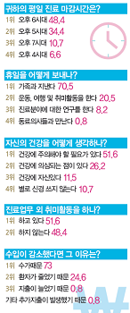 ‘휴일을 어떻게 보내는가’에 대한 질문에는 전체 응답자 중 70.5%가 ‘가족과 함께 지낸다’로 응답했고, ‘운동 및 여행, 취미활동을 한다’(20.5)순이었다. 특히 30대의 경우는 ‘가족과 지낸다’(80%)는 응답자가 가장 많았고 그 다음이 40대(70%)순이었다. 50대에 이어 20대도 ‘가족과 지내는 시간 외에 운동 및 취미활동을 한다’는 응답자가 25%였고 그 뒤를 30대(24%)가 이었다.