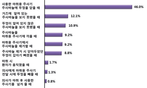 치과 진료 시 주사바늘 찔림 사고는 ‘사용한 마취용 주사기의 주사바늘에 뚜껑을 닫을 때’(46.3%) 가장 많이 발생하고, 특히 진료 후 주사바늘 제거 과정에서 ‘주사바늘 뚜껑을 끼우고, 버리는 처리 방법’(63.6%)을 사용하는 치과에서 많이 나타났다. 이에 대해 연구자는 “주사기의 사용 후 정리 할 때에는 안전을 위해서 뚜껑을 덮는 습관이 오히려 주사바늘 찔림 사고로 이어지는 것으로 사료된다.”라고 밝혔다.