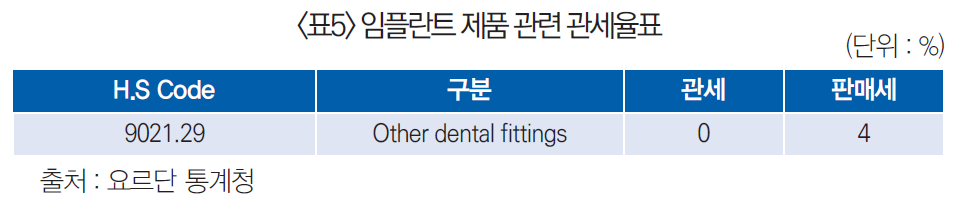 또한 임플란트 제품과 관련해 관세는 없고 판매세는 4%로 세금이 높지 않은 것도 요르단 시장의 진입장벽이 낮은 이유다. <표5>