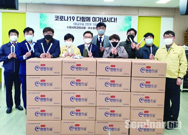 기증 물품인 칫솔 2만개는 수원시치과의사회와 (주) 수호천사엔젤(대표 김주형)이 함께 마련한 것으로 코로나19 확산으로 어려움에 처한 지역의 이웃과 자가격리 대상자에게 쓰여질 예정이다.