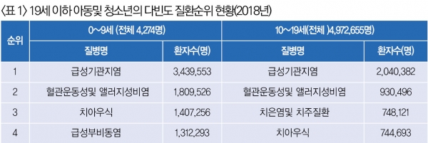 전체 건강보험 대상자와 비교했을 때 0~9세 아동은 전체의 32.9%가 치아우식을, 10~19세 아동 및 청소년은 전체의 15%가 치은염 및 치주질환,15%가 치아우식을 경험하고 있는 것으로 나타나 아동 및 청소년 중 최소 3명은 치아우식이나 치은염, 치주질환을 경험하고 있음을 알 수 있다.