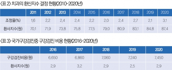 건강보험수가는 고정값인 행위별 상대가치 점수와 변동값인 환산지수로 결정된다. 환산지수를 결정하는 공단과 의료계 간 계약에서 치과는 지난 10년간 평균 2.3%대의 비율로 상승했다.