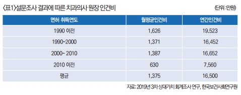면허 취득연도에 따라 원장 인건비를 살펴보면 1990년 전에 면허를 취득한 의사의 평균 인건비는 19,523만원, 1990년~2000년 사이에 취득한 경우는 16,462만원, 2000년~2010년 사이에 취득한 경우는 16,652만원, 2010년 후에 취득한 경우는 7,560만원으로 면허 취득년도가 최근일수록 원장 인건비는 낮아졌다. <표1>