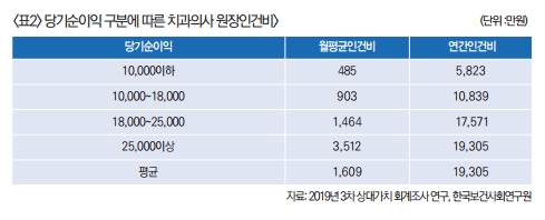치과인력 중 치과의사는 전임, 비전임 전공의로 구분된다. 이중 치과의사 인건비로 사용할 수 있는 가장 합리적인 치과의사는 전임교원인데 의료기관부담 4대보험료와 인건비를 합한 전임교원 월 평균 인건비는 1,285만원이며 연간 15,416만원으로 조사됐다.