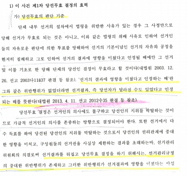 민사부는 “선거의 절차에서 위반한 사유가 있는 경우 그 사정만으로 선거가 무효되는 것이 아니라 위배 사유가 선거의 결과에 영향을 미쳤을때만 당선무효가 인정된다"고 보았다.(대법원 2003.12.26. 선고 2003다11837 판결참조)