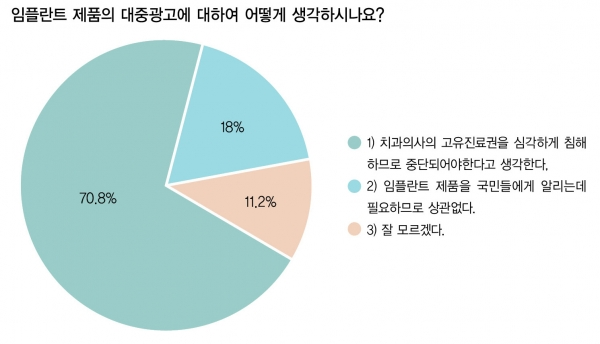 먼저 ‘임플란트 제품의 대중광고에 대해 어떻게 생각하는가’ 라는 질문에 총 2,187명의 회원이 응답했으며 응답자중 1,548명 (70.8%)이 ‘치과의사의 고유의 진료권을 심각하게 침해하므로 중단되어야 한다’고 응답했다. 뒤를 이어 ‘임플란트 제품을 국민들에게 알리는데 필요하므로 상관없다’고 응답한 회원은 393명(18%)에 불과했다. ‘잘 모르겠다’는 응답자는 246명(11.2%)으로 나타났다.