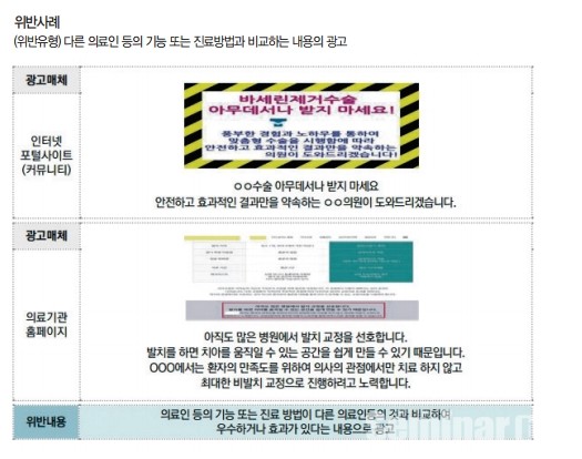 주요위반 사례는 △의료인의 진료방법과 관련 심각한 부작용 등 중요한 정보를 누락한 광고, △다른 의료인의 기능또는 진료방법과 비교하는 내용의 광고,△의료인의 경력이나 시술경험에 대한 거짓이나 과장된 내용 △객관적 사실과 다른 내용과 거짓된 내용의 광고 (예:전세계 최초, 최고, 유일) △로그인의 절차없이 불특성 다수에게 치료경험담 광고 게시 . △신의료기술평가를 받지 않았거나 평가결과가 진행중인 의료행위를 광고하는 행위△신문 방송, 잡지를 이용하여 기사 또는 전문가의 의견형태로 표현되는 광고 등이다.