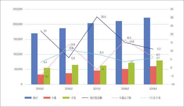 생산업체와 생산품목도 전년보다 증가해 생산업체는 2019년 382개소(2018년(335개소) 대비 14%↑), 생산품목은 2019년 2,881개(2018년(2,648개) 대비 8.8%↑)로 나타났다.