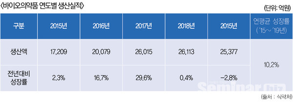 2019년 국내 바이오의약품 시장규모는 2조 6,002억원으로, 2018년 2조 2,309억원대비 16.6% 증가했다. 바이오의약품 중 가장 큰 비중을 차지하고 있는 유전자재조합 의약품은 시장규모가 처음으로 1조원을 돌파했다.
