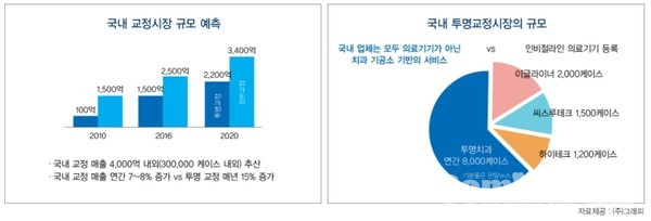 2016년 8억 달러 규모로 추산되는 기존의 전통적인 교정(메탈 와이어, 브래킷) 시장은 성장이 정체돼 있는 반면에 15억 달러 규모의 투명교정 시장은 외모에 민감한 13~19세 환자를 타겟으로 두 자릿 수 이상의 성장률을 유지하고 있다. 전체 교정시장 증가속도보다 투명교정 시장 증가속도가 2배에 달한다.