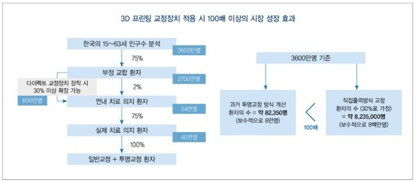 3D 프린팅 교정장치 적용 시 100배 이상의 시장 성장 효과가 있는 것으로 분석된다. 즉, 직접 출력방식교정환자의 수를 30%로 가정했을 때 약 8백만명으로 추산되며 이는 과거 투명교정방식 계산환자수의 100배에 달하는 수치다.