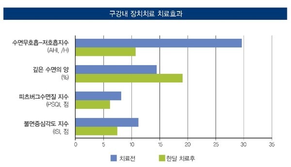 이번 연구는 중등도 이상의 수면무호흡 환자 45명을 대상으로 한 달동안 구강내 장치 치료 후 효과를 확인했다. 그 결과 구강내 장치치료가 중등도 이상의 심한 폐쇄성 수면무 호흡 환자도 불면증이 해소됐다.