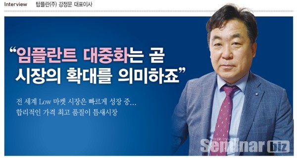 ‘시작은 미약하지만 나중은 창대해지리라’는 성경의 말씀처럼 첫발을 내딛는 것은 언제나 어렵다. 그러나 시작은 벌써 반이 된다. 국내 임플란트 시장은 해마다 성장 가도를 달리고 있다. 그 대열에 합류하기 위해 야심차게 도전장을 내민 회사가 바로 탑플란이다. 탑플란은 기존의 임플란트 회사와 달리 그 출발부터 최고를 추구했다. 바로 해외시장을 공략을 위한 오스템의 수출전용자회사로 출발했기 때문이다. 영업직원 30명, 국내지점 15개로 시작해 지난 2017년에 설립된 탑플란 강정문 대표를 만나 앞으로의 시장에 대한 목표와 회사의 비전을 들어 봤다. (편집자주)