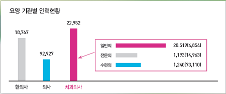 요양기관별 인력현황을 보면 치과의사 22,952명(전문의1,240명, 일반의 20,519명,수련의 1,193명)이었다. 이에 반해 한의사는 18,767명 의사는 92,927명으로 조사됐다. 요양급여 총비용은 54조 5275억 원이었으며 치과의원은 2조 2884 억원으로 지난해기준 21.4%가 증가 했다. 치과병원은 1328 억 원으로 25.4%가 증가했다.