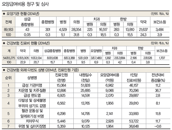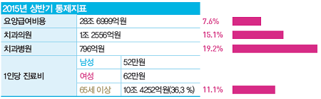 2015년 상반기 통계지표를 보면 요양급여 비용은 28조 6999억 원으로 7.6% 증가했고 치과의원은 1조 2556억 원으로 15.1% 증가했다. 치과병원은 796억 원으로 19.2% 증가했다. 1인당 진료비는 남성이 52만원 여성이 62만원으로 여성이 남성보다 10만원 더 많았다. 65세 이상진료비는 10조 4252억 원으로 36.3%를 차지해 지난해보다 11.1% 증가했다.