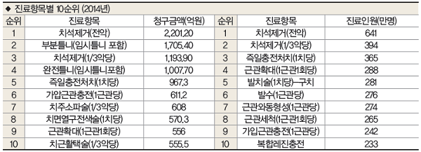진료 인원이 가장 많은 진료항목은 전악치석제거가 641만 명으로 가장 많았다. 2위는 치석제거(3/1악당)은 394만 명으로 2위를 차지했다. 3위는 즉일 충전처치(1치당) 365만 명으로 드러났다.