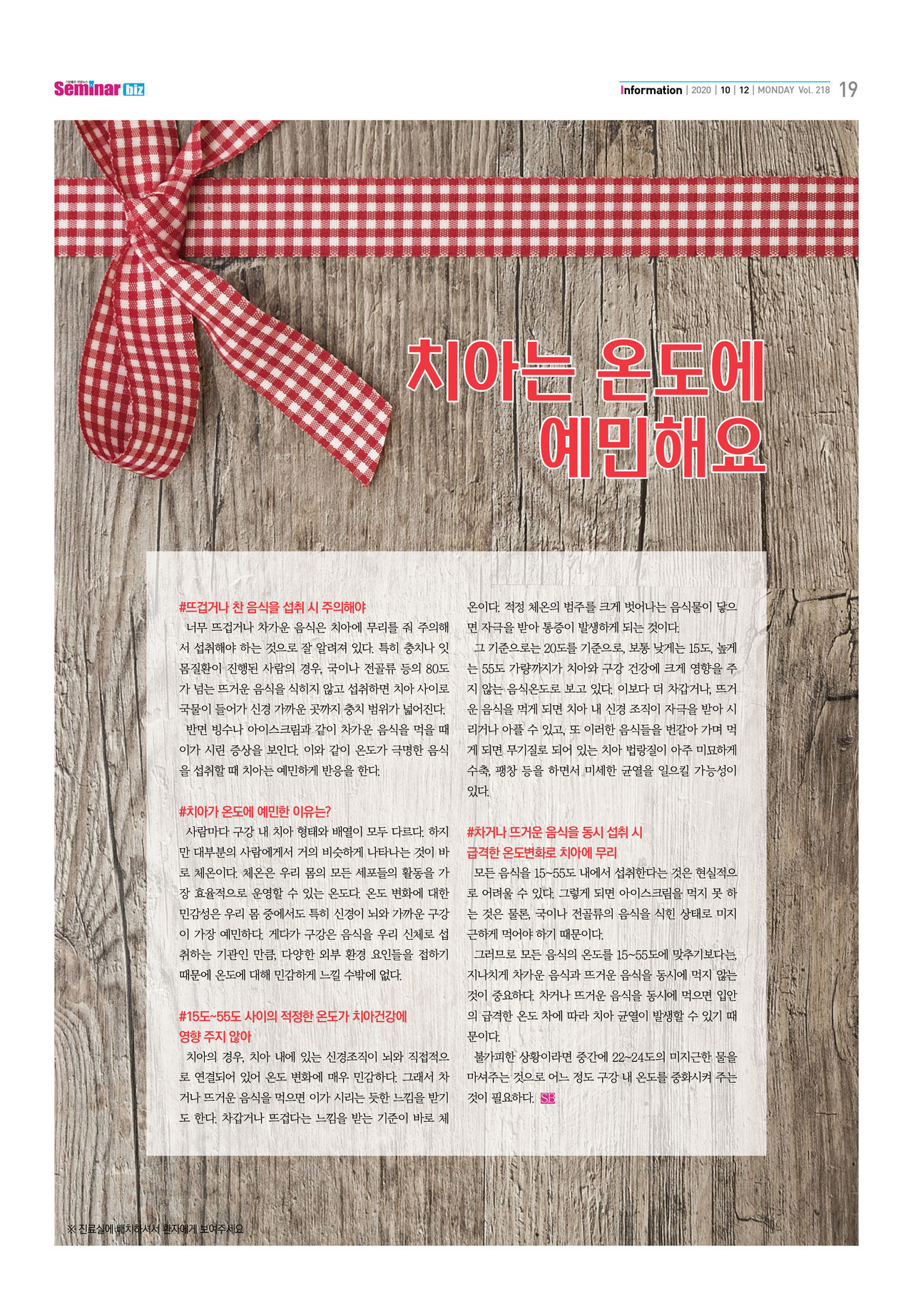 너무 뜨겁거나 차가운 음식은 치아에 무리를 주기 때문에 주의해서 섭취해야 하는 것으로 잘 알려져 있다. 특히 충치나 잇몸질환이 진행된 사람의 경우, 국이나 전골류 등의 80도가 넘는 뜨거운 음식을 식히지 않고 섭취하면 치아 사이로 국물이 들어가 신경 가까운 곳까지 충치 범위가 넓어진다.