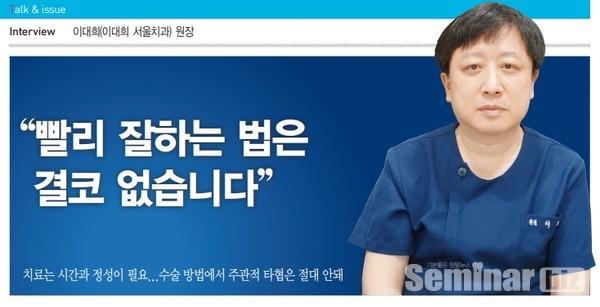 치과의사로서 30년 가까이 진료한 이대희 원장은 천천히 가야 한다고 말한다. 세상에 빠르고 확실한 것은 없다는 것이다. 이대희 원장의 대화 목소리는 조용하지만 강한 울림이 느껴진다. 천천히 기본을 다져야 하는 느림의 미학을 강조하는 그의 메시지가 더욱 깊어지는 이유다. (편집자주)