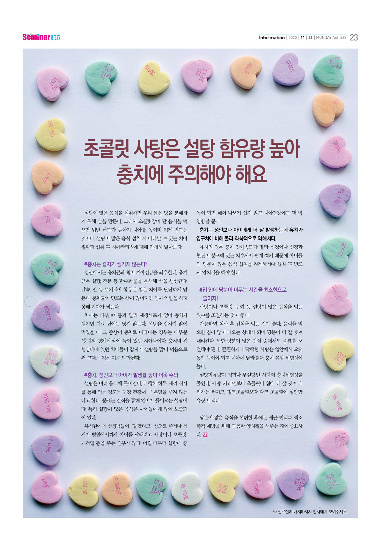 설탕이 많은 음식을 섭취하면 우리 몸은 당을 분해하기 위해 산을 만든다. 그래서 초콜릿같이 단 음식을 먹 으면 입안 산도가 높아져 치아를 녹이며 썩게 만드는 것이다. 설탕이 많은 음식 섭취 시 나타날 수 있는 치아질환과 섭취 후 치아관리법에 대해 자세히 알아보자.