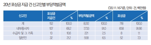 지금까지 공익신고를 통한 장기요양기관 조사결과, 1,395개 기관에서 613억원을 적발했고, 지급된 포상금은 총 56억원에 달한다. 2020년 부당청구 장기요양기관신고포상금 지급대상자는 152명이며 지급한 포상금은 총 7억원에 이른다.