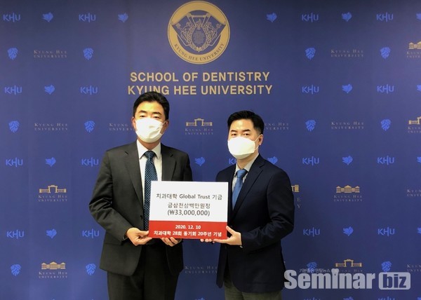 경희대학교 치과대학 28기(대표 이윤)가 졸업 20주년 기념 모교인 경희대 치과대학(학장 정종혁)에 발전기금 3천3백여 만원을 지난 12월10일 기탁했다. <사진>
