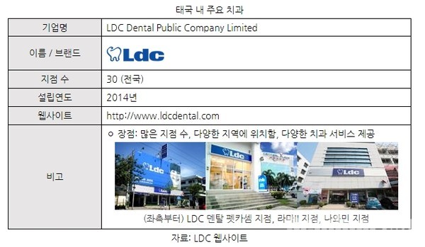 태국의 치과는 우리나라와 마찬가지로 대부분 개인의원의 형태로 운영되어, 규모가 작고 제공 서비스가 제한적인 편이다. 그러나 LDC 치과 등 일부는 전국에 다수의 치과를 운영하기도 한다.