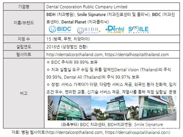 참고 자료: 태국 식약청, 사업개발국(DBD), 태국 관세청, 태국 통계청(NSO), 태국 공중보건부산하 요양치료기술국, Global Trade Atlas, 주요 치과 웹사이트(www.dentalhospitalbangkok.com, www.dentalhospitalbangkok.com, http://dentalcorpthailand.com, https://dentalhospitalthailand.com, www.ldcdental.com) 및 KOTRA 방콕무역관 자료종합
