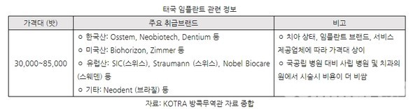 태국의 치과용임플란트와 치과교정용 와이어(HS 9021.90: 기타 정형외과용 기기) 수입은 독일, 미국, 스위스산 수입이 활발한 가운데 2019년 한국산 수입은 87만 달러로 전년 대비 246.5% 증가하면서 6위를 기록했다.