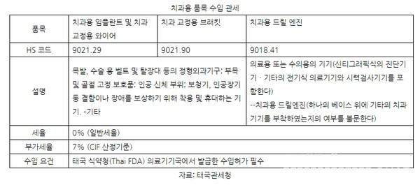 태국 내 치과용 임플란트 기구, 교정용 브래킷, 치과용 드릴 등을 수입할 경우 수입관세가 0% 이므로 부가세로 CIF의 7%만 납부하면 된다. 그러나 제품 수입에 앞서 태국 식약청을 통한 의료기기 수입업자 등록 및 일반 의료기기에 준하는 제품 등록(인증)을 거쳐야 한다.
