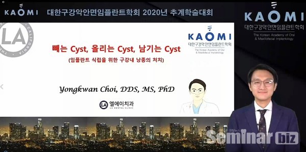 최용관 (엘에이치과) 원장은 ‘빼는 cyst, 올리는 cyst, 남기는 cyst (임플란트 식립을 위한 구강내 낭종의 처치)’를 주제로 임플란트 수술에 앞서 상악동 골이식을 진행할 때 낭종병소에 대한 처치및 임상 증례들에 대해 상세히 설명했다.
