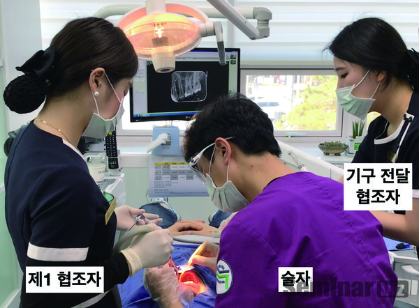 치과수술 역시 그때그때 필요에 따라 수술팀이 적절하게 구성되어야 하며 특히 필요시 반드시 ‘기구전달 협조자’ 또는 ‘순환 협조자’ 역할이 상정될 수 있어야 합니다. 이때 치과위생사는 치과수술에 특화된 수술실 간호사로 그 역할을 이해할 수 있습니다. 치과용 유니트 체어는 곧 하나의 수술실이기 때문입니다.