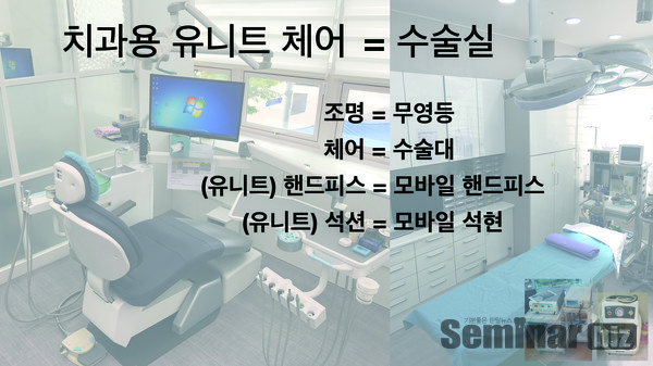 치과용 유니트체어의 조명은 수술실의 무영등에, 체어 자체는 수술대에 대응합니다. 치과용 유니트 체어에 딸린 핸드피스와 석션과 똑같은 기능을 가진 장비들이 수술실에도 구비되어 있습니다.
