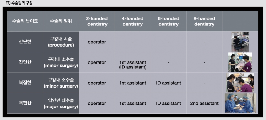 여기서 핵심은 6-handed denti stry(or surgery)의 경우 ‘제2 협조자’가 아니라 ‘기구 전달 협조자’가 수술팀으로 상정된다는 것입니다.