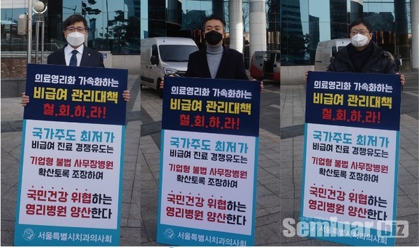 서울시치과의사회(회장 김민겸)는 최근 보건복지부가 추진하고 있는 의원급 비급여 진 료비용공개반대를 위한 성명서를 발표했다. 이와 함께 서울시치과의사회 4,800여 회원을 대표해 김민겸 회장과 임원들이 보건복지부 장관 서울집무실이 위치한 서울시티타워 앞에서 1인 릴레이시위를 지난 14일 진행했다.