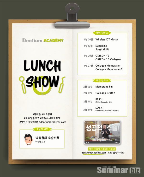 2월 3일에는 Membrane Pin, 2월 10일에 는 Collagen Graft 2, 2월 17일에는 RE Kit(Ri dge Expander Kit), 2월 24일 DASK(Dentium Advanced Sinus Kit)에 대한 박정철 교수의 Lunch Show가 진행된다.