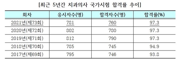 치과의사 응시자는 781명이었으며 합격자는 760명으로 합격률 97.3%에 달한다.
