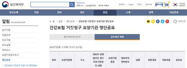 해당 기관의 명단은 보건복지부 누리집(www.mohw.go.kr)에 접속 후 알림 → 명단공표 → 건강보험 거짓청구 요양기관 명단에서 확인할 수 있다.