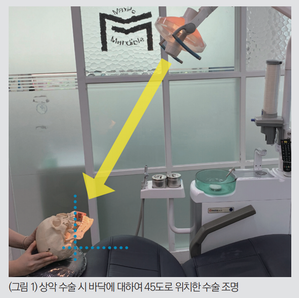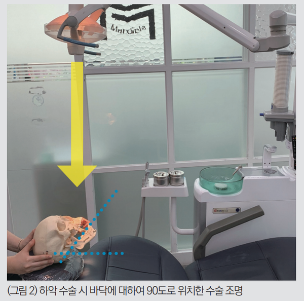 앞서 환자 포지션을 설정할 때 즉 환자 머리 위치와 개구량을 설정할 때 수술 부위가 상악인 경우 교합 평면을 바닥에 대해 최소 90도로(또는 그 이상), 수술 부위가 하악인 경우 교합 평면을 바닥에 대하여 최소 45도로(또는그 이하) 설정한다고 했습니다. 이를 종합해 설명하면 수술 부위가 상악인 경우 수술 조명은 바닥에 대하여 45도로, 수술 부위가 하악인 경우 수술 조명은 바닥에 대하여 90도로 설정해야 합니다.