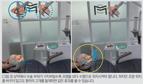 치과용 유니트 체어 상 진료, 수술에 있어 치료 부위(수술 필드)에 대한 명확한 ‘시야 확보’와 안전한 ‘기구 접근’을 가능하게 하는 데 가장 기본이 되는 하지만 사실상 간과되고 있는 ‘환자의 포지션’, ‘술자와 협조자의 포지션’ 그리고 ‘수술 조명의 적용’에 대해 말씀드리고 있습니다. 지난 호 ‘환자의 포지션’, ‘술자와 협조자의 포지션’ 설정에 이어 ‘수술 조명의 적절한 적용’에 대해 설명하겠습니다.