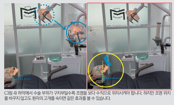 하지만 수술 중 수술 부위가 구강 내에서 더 깊어지거나 얖아진다면 수술 조명의 위치를 변경시키는 것 보다 환자의 머리 위치를 변경시키면 - 즉 상악이 수술 부위인 경우 고개를 더 들도록, 하악이 수술 부위인 경우 고개를 더 숙이도록, 어느 경우든 개구량은 더 크게 환자에게 지시 - 수술필드를 유지하면서 또 4-handed dentistry(or surgery)를 유지하면서 수술을 진행할 수 있습니다.