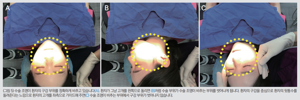 이 경우 매번 수술 조명의 위치를 재설정하는 것은 4-handed dentistry(or surgery)를 유지할 수 없게 하는 주요 원인이 되어 수술의 효과적인 진행을 크게 방해하게 됩니다. 즉, 수술 중 어느 순간 수술 조명이 적절하게 수술 부위로 비춰지지 않는다면 환자의 적절한 머리 위치와 개구량을 다시 확인하여 고정되도록 지시하고 격려해야 하며 수술 조명을 재위치시키는 것은 최소한으로 해야 합니다.