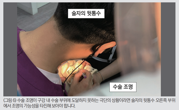 어떻게 해도 수술 조명이 구강 내 수술 부위에 도달하지 못하는 극단의 상황이라면 술자가 헤드 라이트를 쓰거나 또는 술자의 뒷통수 오른쪽 부위에서 조명의 가능성을 타진해 보아야 합니다. 협조자 쪽에서 조명의 가능성을 살펴보는 것은 대부분의 경우 시간낭비가 됩니다.