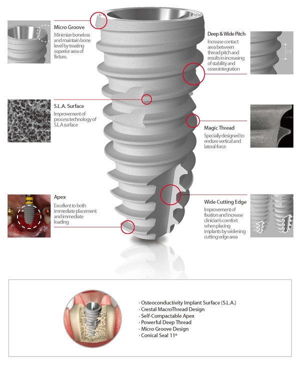 임플란트 상단부의 Micro Groove는 임플란트가 연조직 부분에 고정이 되도록 해 골 손실을 최소화 한다. Open Thread 디자인은 임플란트가 Bone Level에서 고정되도록 골유착을 유도한다. 기존 CMI IS-II active 대비 2배 증가된 하단부의 Cutting Edge 면적은 잇몸뼈의 압력을 최소화 하면서 Self-Tapping 능력을 향상시킨다. 또한, 측방 힘에 약한 Double Thread의 단점을 극복하기 위해 측방 저항력이 강한 Single Thread 디자인을 적용했다. 나사산 사이의 길이를 0.8Pitch에서 0.9Pitch로 늘림으로써 임플란트 표면에 효율적인 골흡착이 이뤄지도록 골융합률을 극대화해 고정력 최대화에 힘썼다.