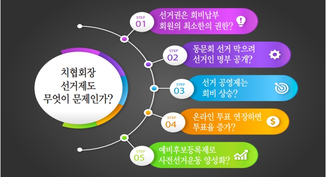 그는 덧붙여 선거비용을 회비로 지원하는 것도 필요하다고 언급했다. “사실 협회장 선거는 회무를 위한 비용으로 볼 수 있기 때문에 개인 후보 비용을 제외하고는 문자 전송비, 우편물 발송비, 선관위 운영비 등은 회무와 관련된 비용이기 때문에 최대한 지원할 필요성이 있다”고 언급했다.
