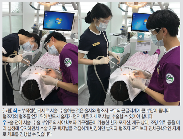 고연차 치과위생사가 석션 어시스트 등 실제 수술에서 협조자로서의 역할을 기피하는 문제의 큰 이유가 시술 시 수술 시 술자와 협조자의 부적절한 자세에 있다고 생각합니다.