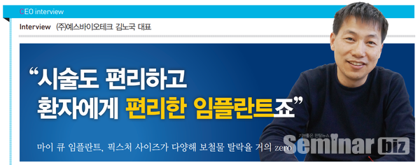 지난 2011년 처음 예스바이테크를 설립한 김노국 대표는 마이 큐 임플란트의 가장 큰 장점은 시술이 편리하다는 점이라고 언급했다. 현재 전국에 500곳 정도의 유저를 보유하고 있는 (주)예스바이오테크는 12번째 첨단기술기업으로 지정되기도 했다. 첨단기술기업으로 지정되면 취득세 3년 면제와 재산세 5년 면제와 법인세 3년 면제 혜택이 주어진다. 뿐만 아니라 (주)예스바이오테크는 국무총리 표창을 수상한 기업이기도 하다. (주)예스바이오테크 김노국 대표가 심혈을 기울여 제작한 마이 큐 임플란트의 가장 큰 특징은 시술의 편리함이다. 3년 전 사옥을 확장 이전한 대구의 (주)예스바이오테크 사옥에서 김노국 대표를 만났다. (편집자주)