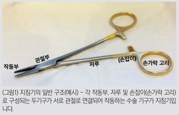 치과용 핀셋 등 대부분의 조직 겸자(tissue forceps)들은 ‘맞접합’된 수술기구들이고 골겸자, 발치 겸자 등은 ‘관절’로 연결돼 작동하는 것들입니다. 이 경우 ‘손잡이’가 ‘손가락 고리’로 대체된 것이 지침기(봉침기), 모스키토, 켈리와 같은 지혈 겸자, 딘 시저와 같은 외과용 가위 등의 수술 기구라고 할 수 있습니다. 기구가 서로 관절로 연결돼 작동하는 수술 기구가 지침기입니다.